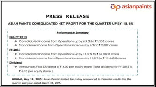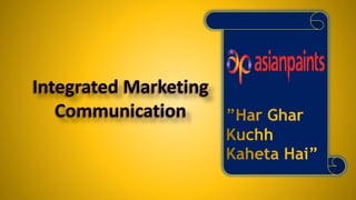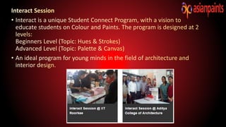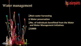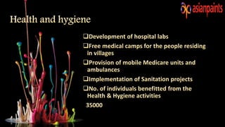 This document discusses Asian Paints' integrated marketing campaigns and corporate social responsibility efforts. It provides details on Asian Paints' activities in education like supporting infrastructure development, providing educational items to students, and benefiting over 25,000 individuals. It also describes Asian Paints' events, social media, email marketing, mobile apps, and how the company uses its information systems and intranets for strategic advantages like improving customer loyalty and market share.