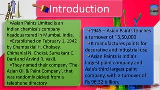 1. Asian Paints is the largest paint company in India and third largest in Asia, with over 50% market share in decorative paints.