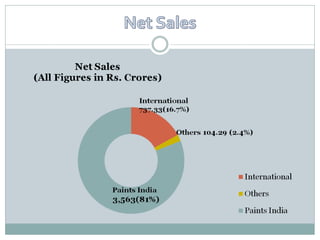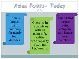 The document provides information about the paint industry in India and Asian Paints. It states that the paint industry in India is estimated at INR 135 billion with 35% of the market being unorganized. Asian Paints started in 1942 and has since become a market leader in India with over 35% market share. It has operations in 17 countries and 23 manufacturing facilities. While it faces threats from competition and raw material price fluctuations, it can leverage opportunities in the rural market and automotive industry.