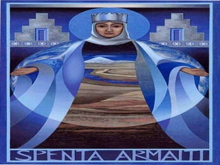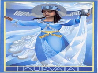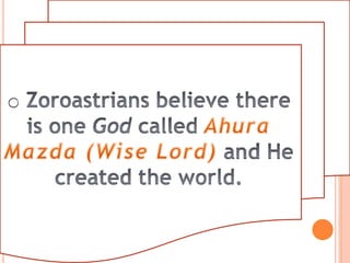 Zoroastrianism is one of the world's oldest monotheistic religions, founded by the Iranian prophet Zoroaster. It believes in a supreme creator god Ahura Mazda who is all good and the source of all goodness and happiness. Zoroastrianism also believes in an ongoing cosmic dualism between good and evil, with Ahura Mazda battling the destructive spirit Angra Mainyu. Followers have free will to choose the path of righteousness or deceit. After life, the soul is reunited with its guardian spirit. Dead bodies are exposed to prevent decay and pollution of the world until the final renovation when good will triumph over evil.