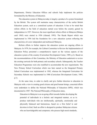 The document discusses the teaching of higher-order thinking skills in Malaysian classrooms. It provides background on Malaysia's education system and details the country's efforts to promote teaching thinking skills since the early 1990s. This included developing new curriculum and resources for teachers, training programs, and monitoring implementation. The document also reports findings from a study which found that while teachers felt knowledgeable about teaching their subject areas, they perceived having less knowledge on teaching higher-order thinking skills within those subjects.