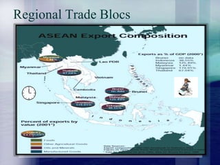 This document discusses regional trade blocs in Southeast Asia and their reasons for trade development, including being natural trading partners due to their multicultural nature and proximity, which has led to increased intra-regional trade and short-term capital inflow. It also compares small and large regional trade blocs and their exchange of goods, services, information, and oil.