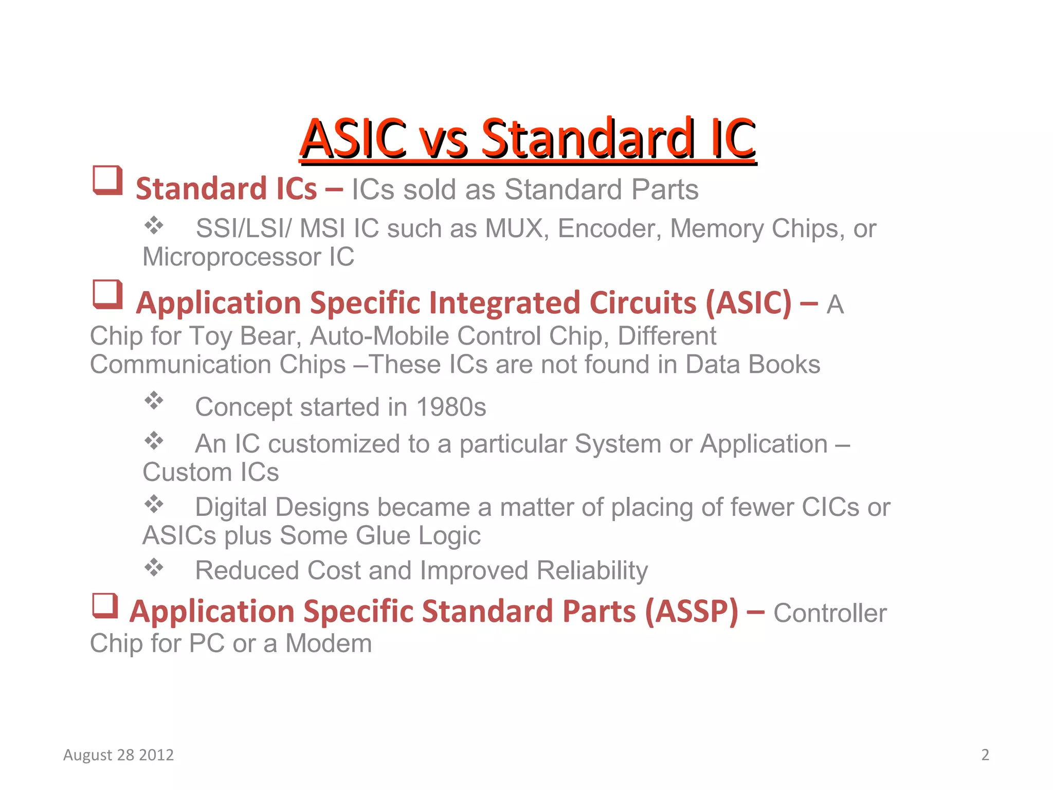 The document discusses different types of application specific integrated circuits (ASICs). It describes ASICs as integrated circuits customized for a particular application, as opposed to standard integrated circuits. The document outlines two main types of ASICs: full-custom ASICs which have all logic cells and mask layers customized, and semi-custom ASICs which use pre-designed logic cells but have customized mask layers. Within semi-custom ASICs it distinguishes between standard cell-based and gate array-based designs. The document also covers programmable ASICs including PLDs, CPLDs and FPGAs.
