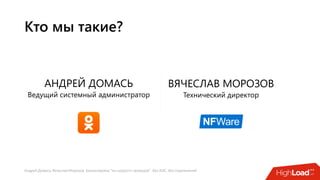 Документ посвящен балансировке трафика 'на скорости проводов' без использования ASIC и описывает решения для борьбы с атаками типа SYN-флуд. Рассматриваются вопросы оптимизации работы серверов, архитектурные особенности, а также преимущества и функциональность системы. В заключении представлены контактные данные авторов для дальнейших вопросов.