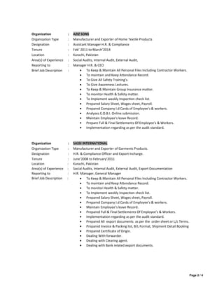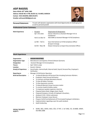 This document contains the resume of Asif Rasool, including his personal details, professional experience, education, skills, and references. He has over 15 years of experience in human resources and compliance roles for various textile and garment manufacturing companies in Karachi, Pakistan. His responsibilities included social audits, payroll, employee records maintenance, and implementing health and safety standards. He is currently the Assistant Manager of HR & Compliance at Hassan Industries, and holds a B.Com degree with expertise in Microsoft Office, Adobe Photoshop, and time management software.