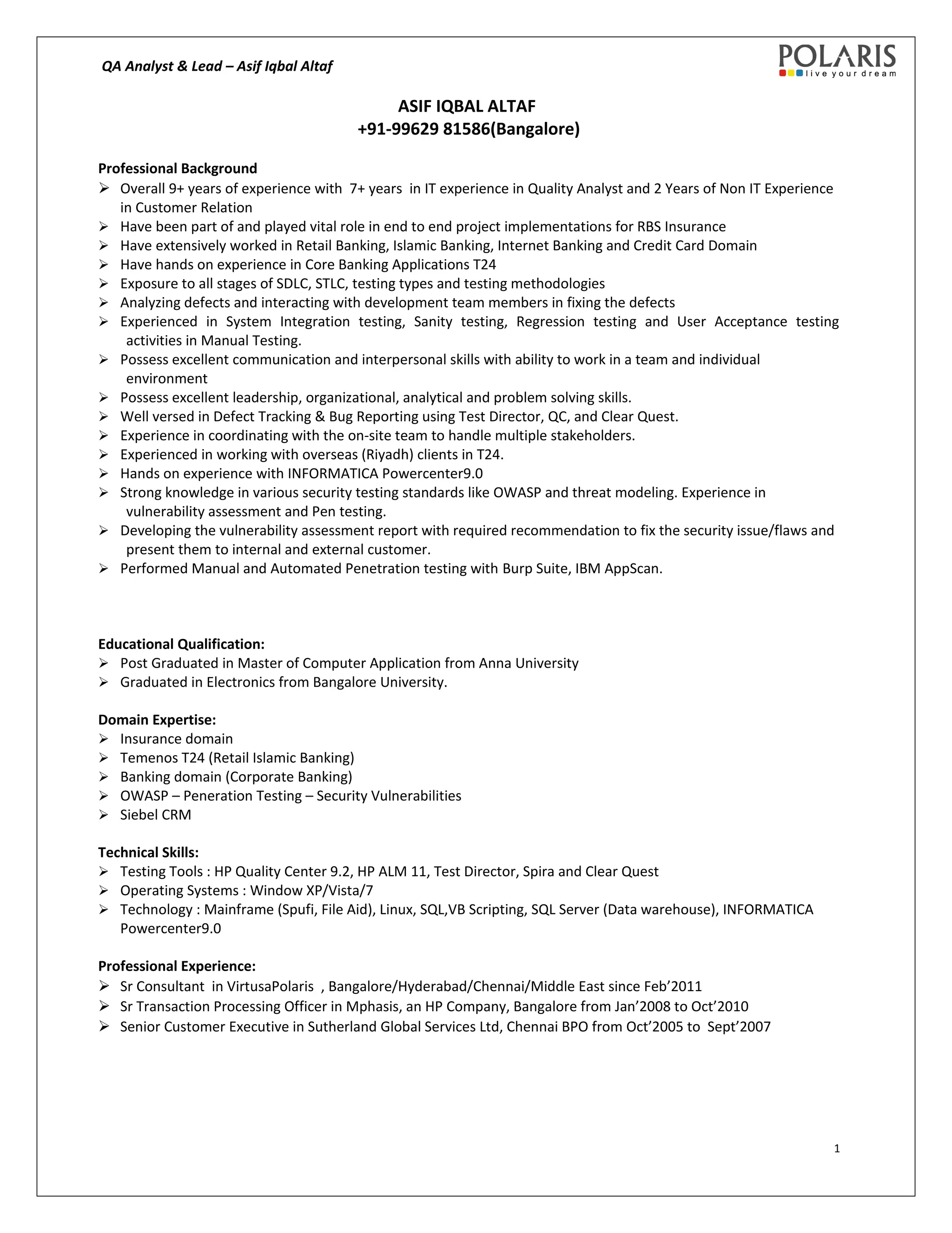 The document provides details about Asif Iqbal Altaf including his professional background working as a QA Analyst and Lead for over 9 years, educational qualifications, technical skills, domains expertise and descriptions of various projects he has worked on testing banking, insurance and other applications. It also includes his passport and personal details.