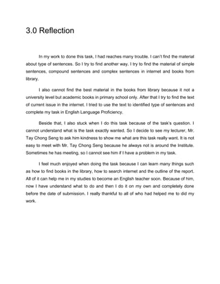 The author struggled to complete the task of identifying sentence types due to difficulties finding relevant materials and understanding what the task required. They were able to get help from their lecturer to clarify the task and then searched online and library books to learn about simple, compound, and complex sentences so they could complete the analysis. In doing so, the author felt they learned valuable skills for their studies to become an English teacher.