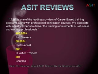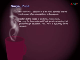 ASIT is a leading provider of career training and professional certification courses, catering to students, job seekers, and working professionals in Bangalore. The organization emphasizes robust technology and optimal learning outcomes, boasting over 400,000 job seekers and 80,000 professionals trained by more than 380 qualified trainers. With a strong commitment to education and learner success, ASIT aims to help individuals thrive in the corporate world.