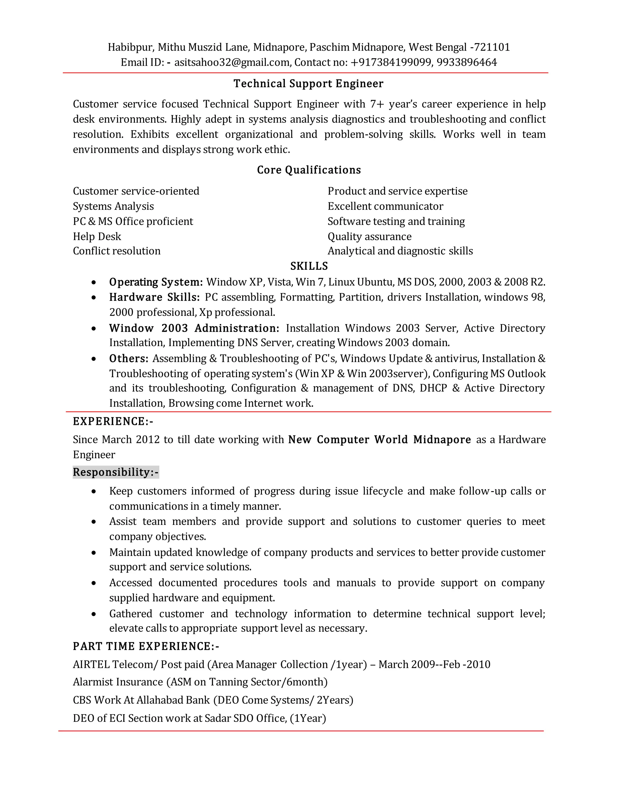 Asit Sahoo is applying for the position of Technical Support Engineer. He has over 7 years of experience in help desk environments, with expertise in systems analysis, diagnostics, troubleshooting and conflict resolution. Currently working as a Hardware Engineer, his responsibilities include keeping customers informed, assisting teammates, maintaining product knowledge, and elevating support calls. He has skills in operating systems, hardware, Windows administration, and networking. Asit is seeking a new opportunity to grow within a company and hopes to be invited for an interview.