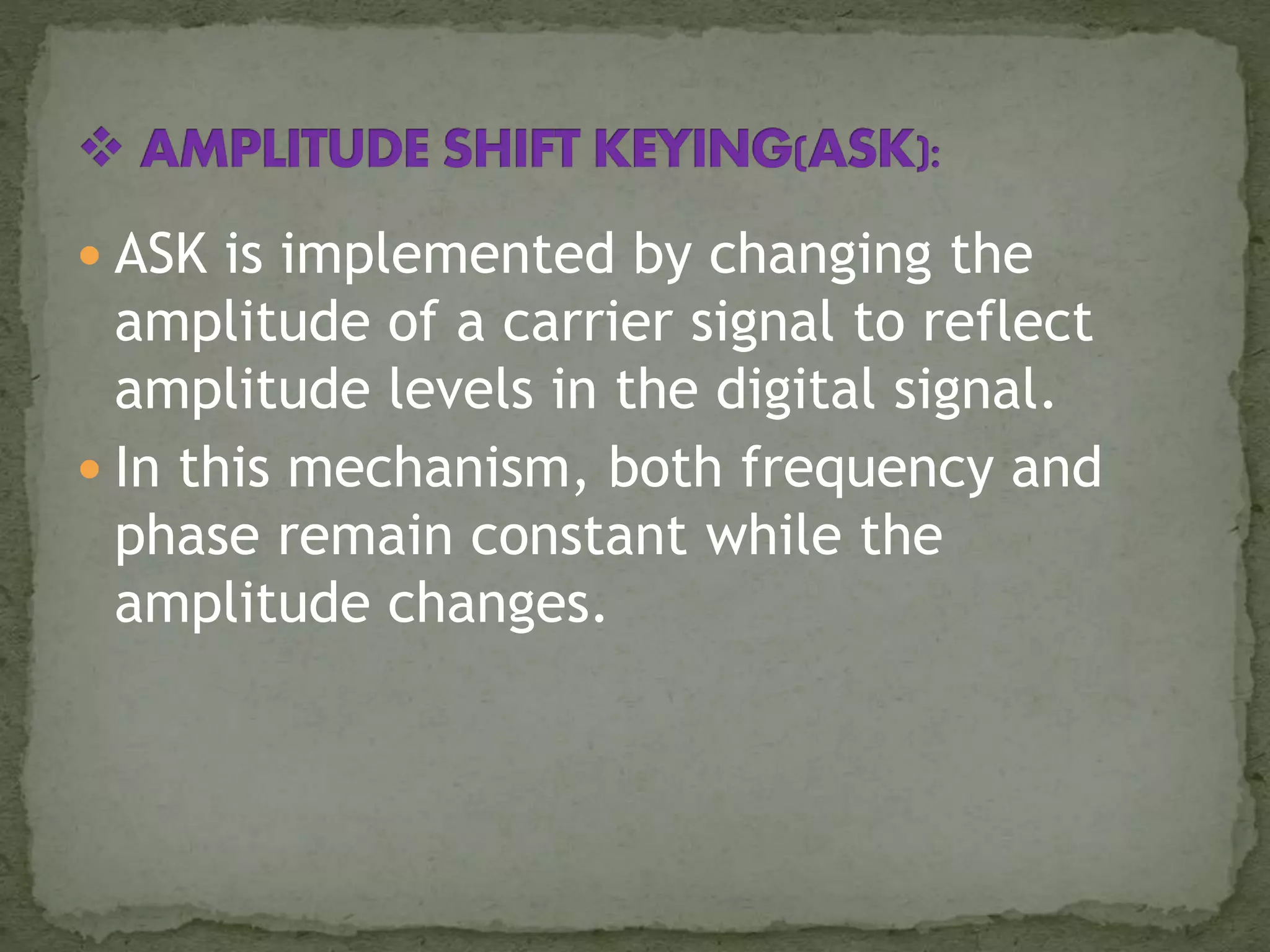 Noman Khan, a 4th semester Computer Science student at GSSCP College, presented on digital modulation techniques ASK, FSK, and PSK. ASK varies the amplitude of a carrier signal to transmit information, making it susceptible to noise interference. FSK varies the frequency, keeping amplitude and phase constant. PSK varies the phase of the carrier while keeping amplitude and frequency constant. PSK has become more common than ASK or FSK and requires less bandwidth than FSK.