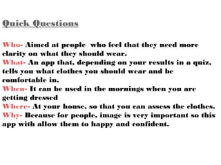 The document describes an app called "Comme un Pro" that provides fashion advice to users. It aims to help people feel more confident in their clothing choices by having them take a quiz and then recommending appropriate outfits based on the weather. The app is intended to be used in the mornings when getting dressed. It analyzes the user's responses and tastes to tell them what clothes they should wear to feel comfortable. The developers believe the app will be successful because many people lack confidence in their fashion choices and want extra help to feel happy and comfortable.