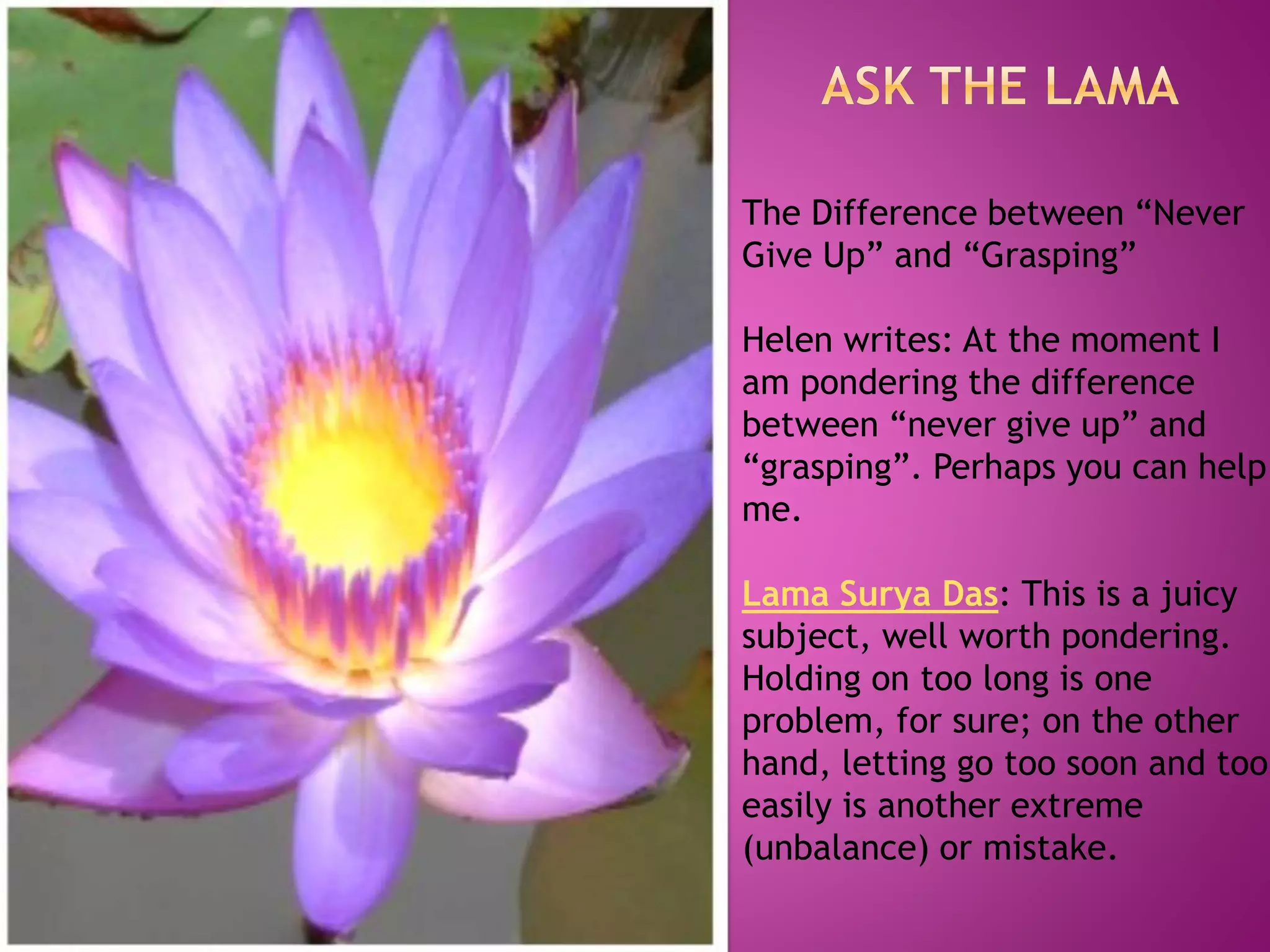 The document explores the nuances between the concepts of 'never give up' and 'grasping', emphasizing the importance of maintaining balance in relationships and commitments. It suggests that while perseverance is valuable, knowing when to let go or say no can be equally crucial for personal growth and spiritual well-being. The discussion is framed as an ongoing journey of self-discovery and discernment through life's experiences.