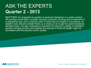 Pension funds should consider investment decisions in the context of sponsor covenant, funding levels, and investments holistically. They should also consider whether the sponsor's financial health correlates with pension assets and the sponsor's ability to withstand funding shocks. Funds should evaluate if increasing allocation to return assets fits their risk policy while considering limitations of volatility as a risk measure and tail risks. Additionally, funds should look at opportunities in the market but be aware that recent returns may have driven up risk asset prices and lowered volatility, making them less attractive.