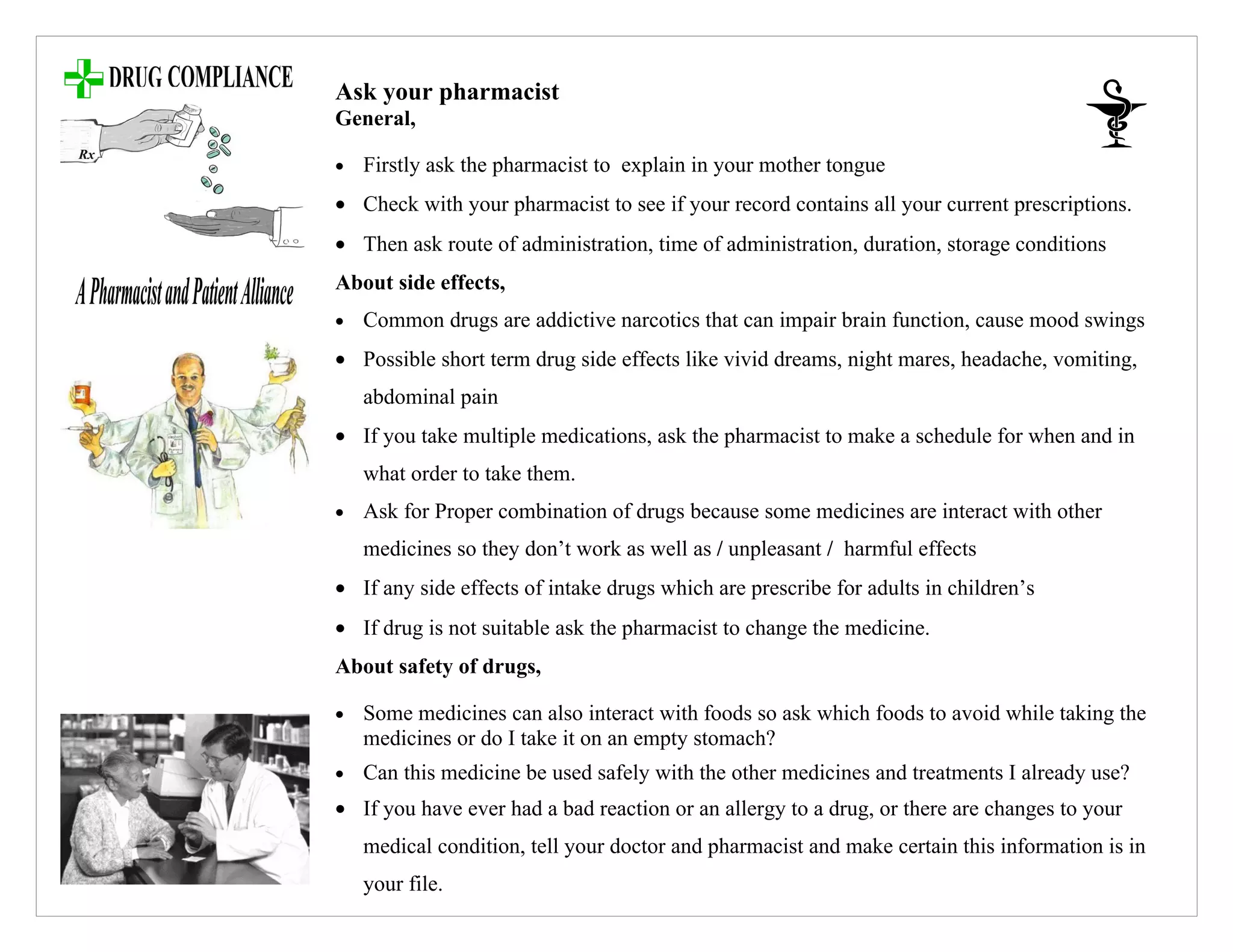 1) Explain the medication in your native language, check for all current prescriptions, and explain administration details like dosage, timing and storage.