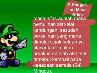 Dokumen tersebut membahas tentang pengertian, tujuan, peranan bidan, asuhan dan kebutuhan dasar masa nifas. Masa nifas adalah masa pemulihan sesudah persalinan selama 6-8 minggu. Tujuan asuhan masa nifas adalah meningkatkan kesejahteraan ibu dan bayi serta mencegah komplikasi. Peranan bidan adalah memberikan asuhan kesehatan dan pendampingan kepada ibu nifas. Asuhan masa nif