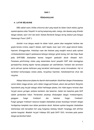 Dokumen ini membahas tentang demam berdarah dengue (DBD), suatu infeksi virus yang disebabkan oleh arbovirus melalui gigitan nyamuk, dengan gejala utama seperti demam, nyeri otot, dan perdarahan. Penyakit ini dapat menyebabkan komplikasi berat, termasuk renjatan hipovolemik dan kematian jika tidak ditangani dengan cepat. Penulisan ini juga mencakup tujuan dan masalah terkait asuhan keperawatan untuk pasien DBD.