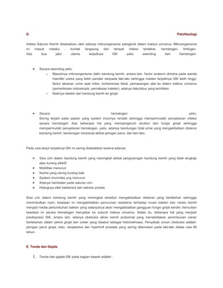 Infeksi Saluran Kemih (ISK) adalah infeksi bakteri pada saluran kemih, yang dapat diklasifikasikan menjadi ISK sederhana dan ISK rumit, dengan penyebab umum adalah E. coli. Faktor risiko pada usia lanjut mencakup sisa urin yang meningkat, penurunan imunitas, dan gangguan anatomi. Penanganan ISK idealnya menggunakan antibiotik yang efektif, dengan pemantauan gejala dan pemeriksaan penunjang untuk mencegah komplikasi.