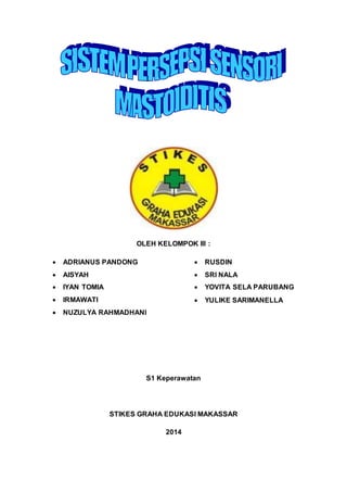 Makalah ini membahas tentang asuhan keperawatan untuk mastoiditis, termasuk pengertian, etiologi, patofisiologi, manifestasi klinis, dan penatalaksanaannya. Mastoiditis adalah inflamasi dari sel mastoid akibat infeksi telinga tengah yang dapat menyebabkan komplikasi serius jika tidak diobati. Selain itu, makalah ini juga menekankan pentingnya pencegahan dan kebersihan telinga untuk menghindari masalah lebih lanjut.