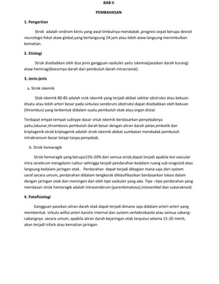 Strok adalah sindrom klinis yang mendadak dan progresif yang disebabkan oleh gangguan peredaran darah otak, dibagi menjadi strok iskemik dan hemoragik. Strok memerlukan penanganan medis yang tepat, termasuk pengelolaan kondisi pasien dan penatalaksanaan asuhan keperawatan. Risiko strok dipengaruhi oleh faktor yang tidak dapat diubah dan yang dapat diubah, termasuk hipertensi dan diabetes.