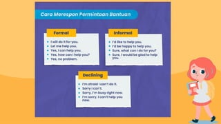 The document discusses the concept of asking for help, categorizing it into formal and informal types, including examples for each. It provides examples of dialogues where help is requested in different situations, highlighting both polite and casual phrases. Additionally, it encourages readers to practice conversations about asking for help.