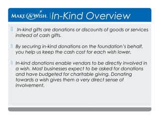 This document provides guidance for wish granters at Make-A-Wish Hudson Valley on securing in-kind donations of goods and services from local businesses to help fulfill wishes. It outlines tips for identifying potential donors, approaching them for donations, following up, and properly documenting donations. The goal is to obtain at least one in-kind donation per wish to help keep costs down while enabling direct business involvement. Asking can be intimidating but most businesses expect requests and want to support the community. Proper procedures are outlined to work with national partners and avoid conflicts with existing sponsorship agreements.