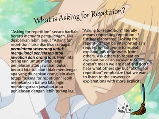 The document contains examples of phrases used when asking someone to repeat what they said in English and their Indonesian translations. It also contains examples of dialogues where one person asks for repetition and multiple choice questions to test understanding of asking for repetition.