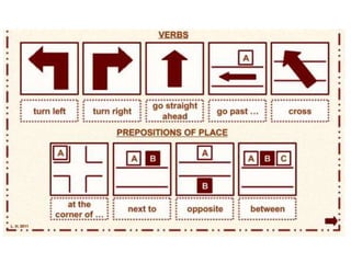 This document provides information about places in a city and directions. It includes a matching exercise to define common places like a barber shop, bank, or post office. Sample dialogues demonstrate asking for and giving directions to a library and supermarket. Another dialogue models asking for the location of the nearest ATM and receiving turn-by-turn directions. The document concludes with a review of useful expressions for asking and giving directions, such as "turn left", "go straight", and locational words like "on the corner".