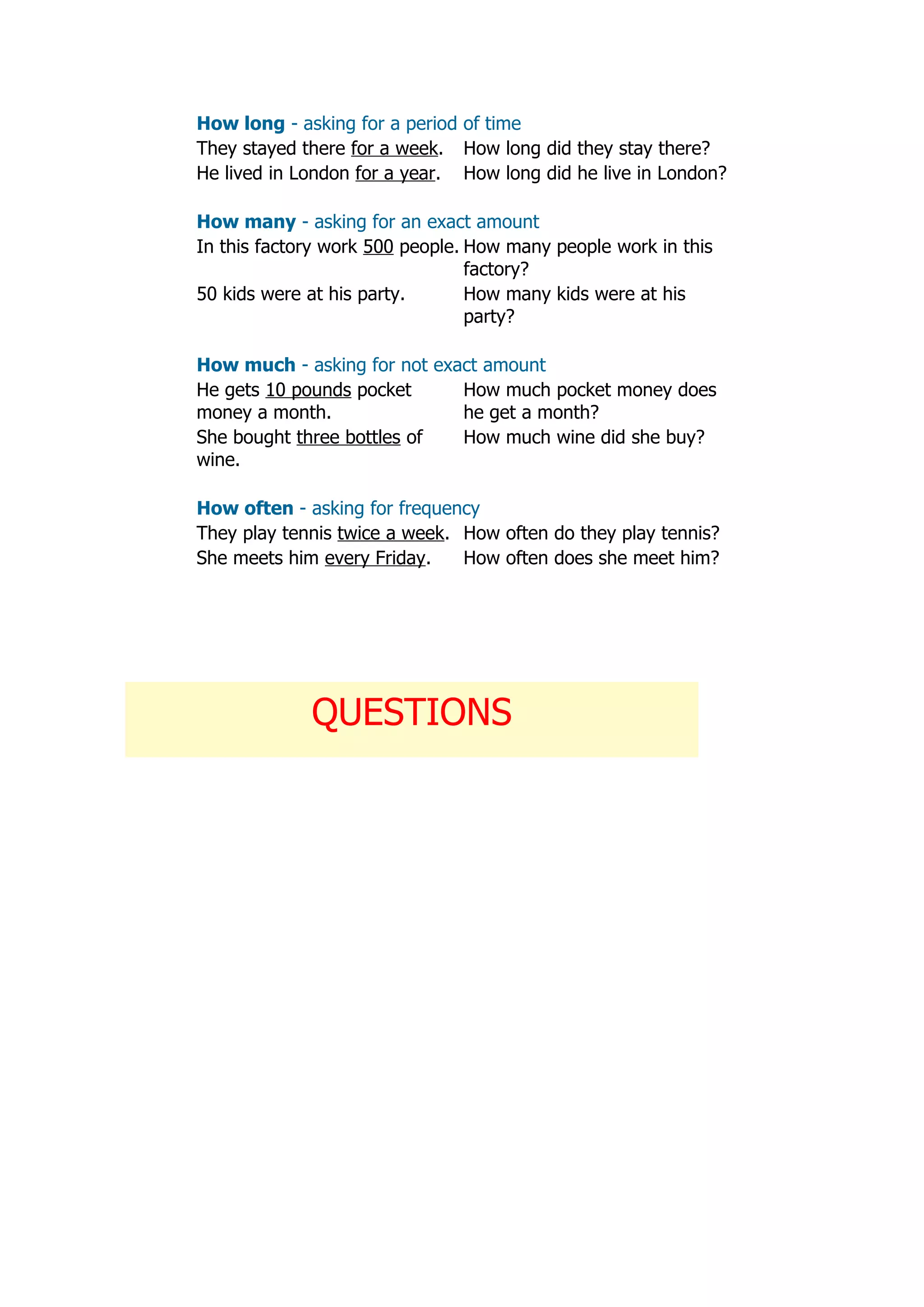 This document provides guidance on asking questions in English by using interrogative words like who, what, whose, when, where, why, how, how long, how many, and how often. It gives examples of questions using these interrogative words in subject and object positions. It then provides a short practice section asking the reader to identify the interrogative word being asked about in sample questions.