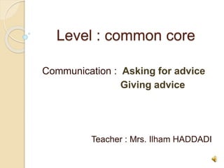 The document provides vocabulary and examples for asking about health, asking for advice, and giving advice related to common illnesses. It includes a matching activity to associate photos with illnesses like headaches, fever, stomach ache, toothache, cough, and flu. Sample dialogues demonstrate asking for advice when having a headache or flu. Expressions for asking about health, asking for advice, and giving advice are listed. An activity practices using should/shouldn't to provide health tips regarding hand washing, physical contact, staying home, and self-care during the coronavirus pandemic. A role play models a patient asking a doctor for advice about cough and fever symptoms.