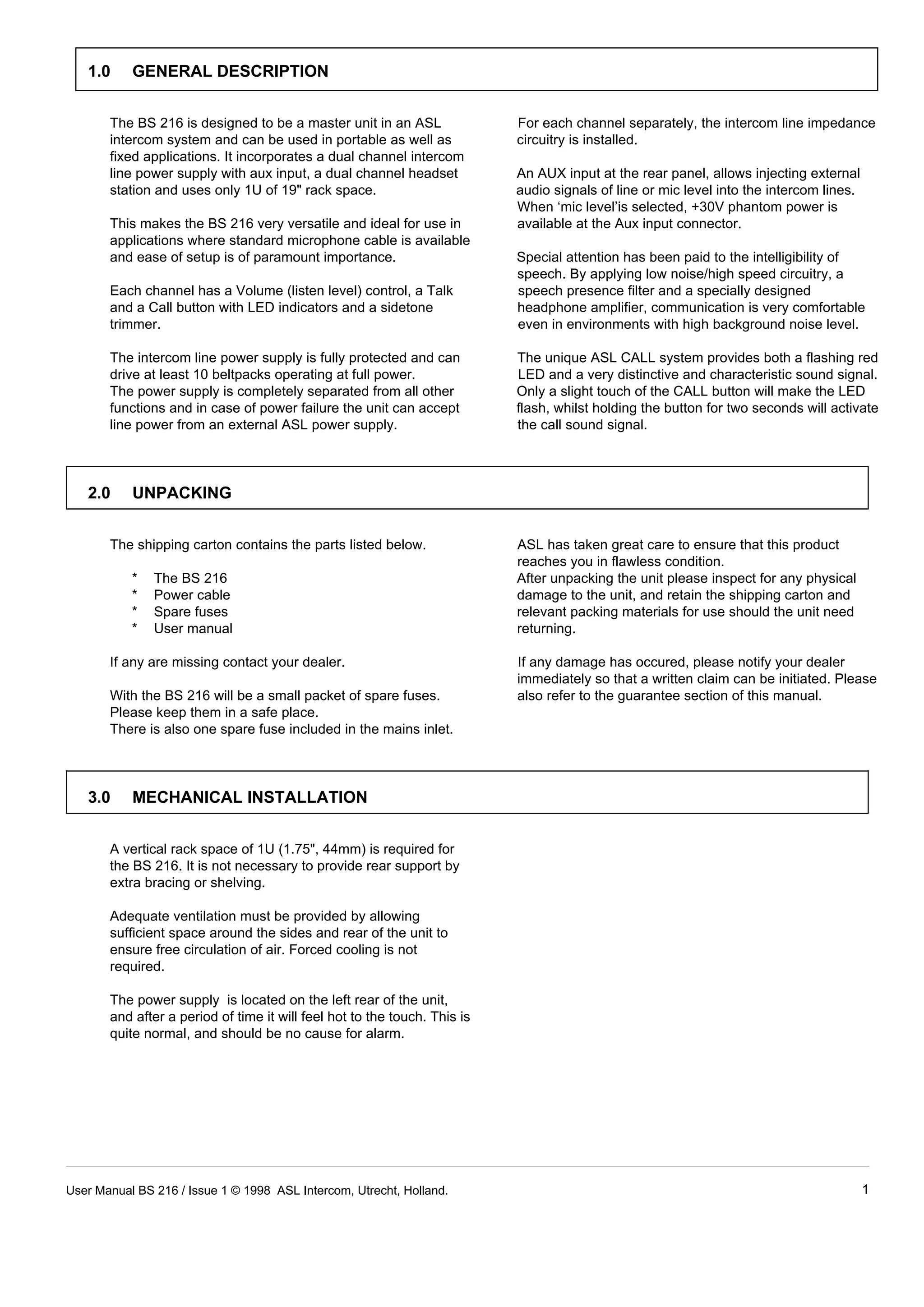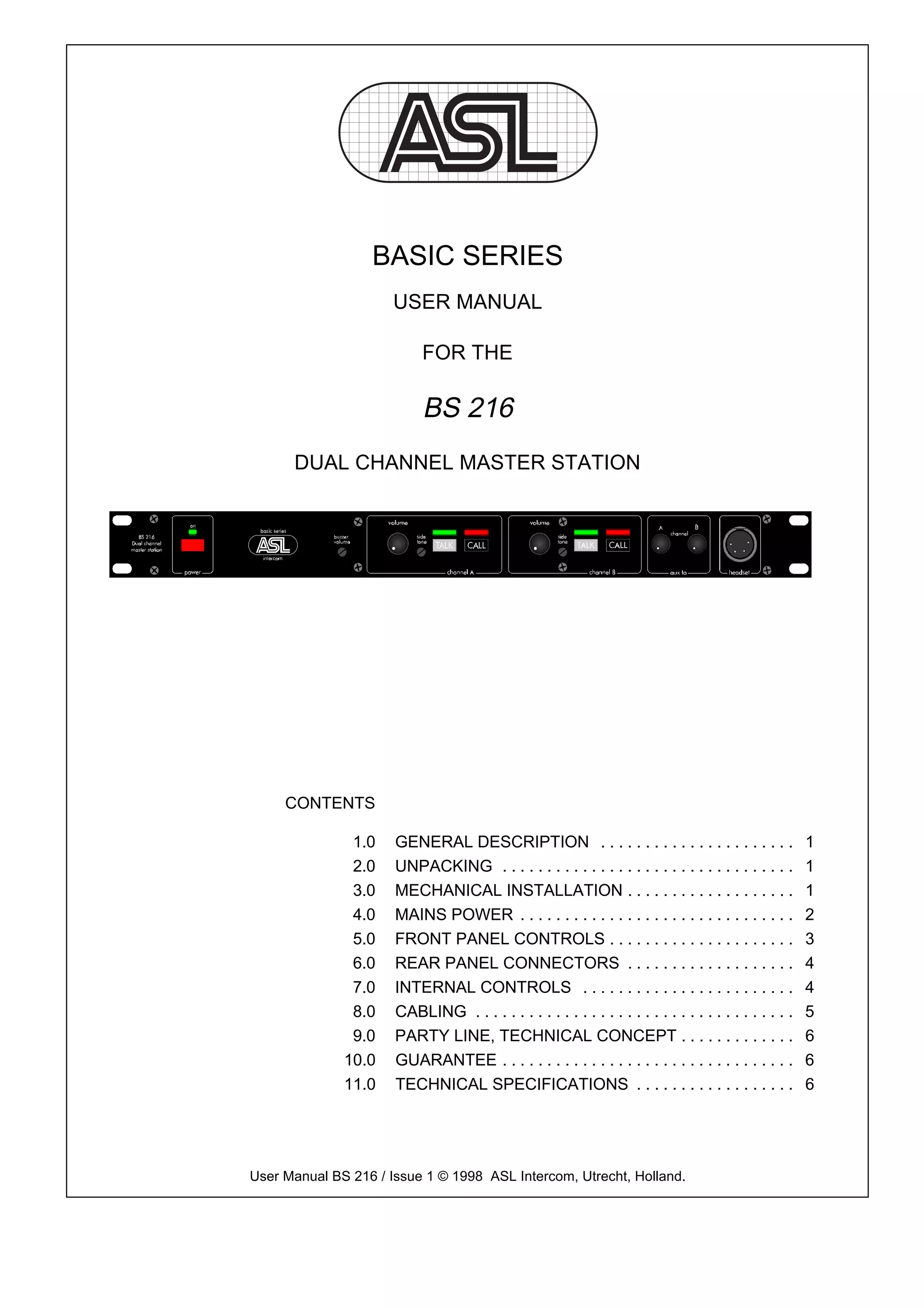 This document is a user manual for the BS 216 dual channel master station. It provides instructions for unpacking, installing, and operating the device. Key features include a dual channel intercom line power supply, auxiliary audio input, and headset station that uses only 1U of rack space. The manual describes front panel controls for volume, talk, call, and sidetone adjustment, as well as rear panel connectors for power, audio lines, and auxiliary input. Cabling guidelines and the technical party line concept are also covered.