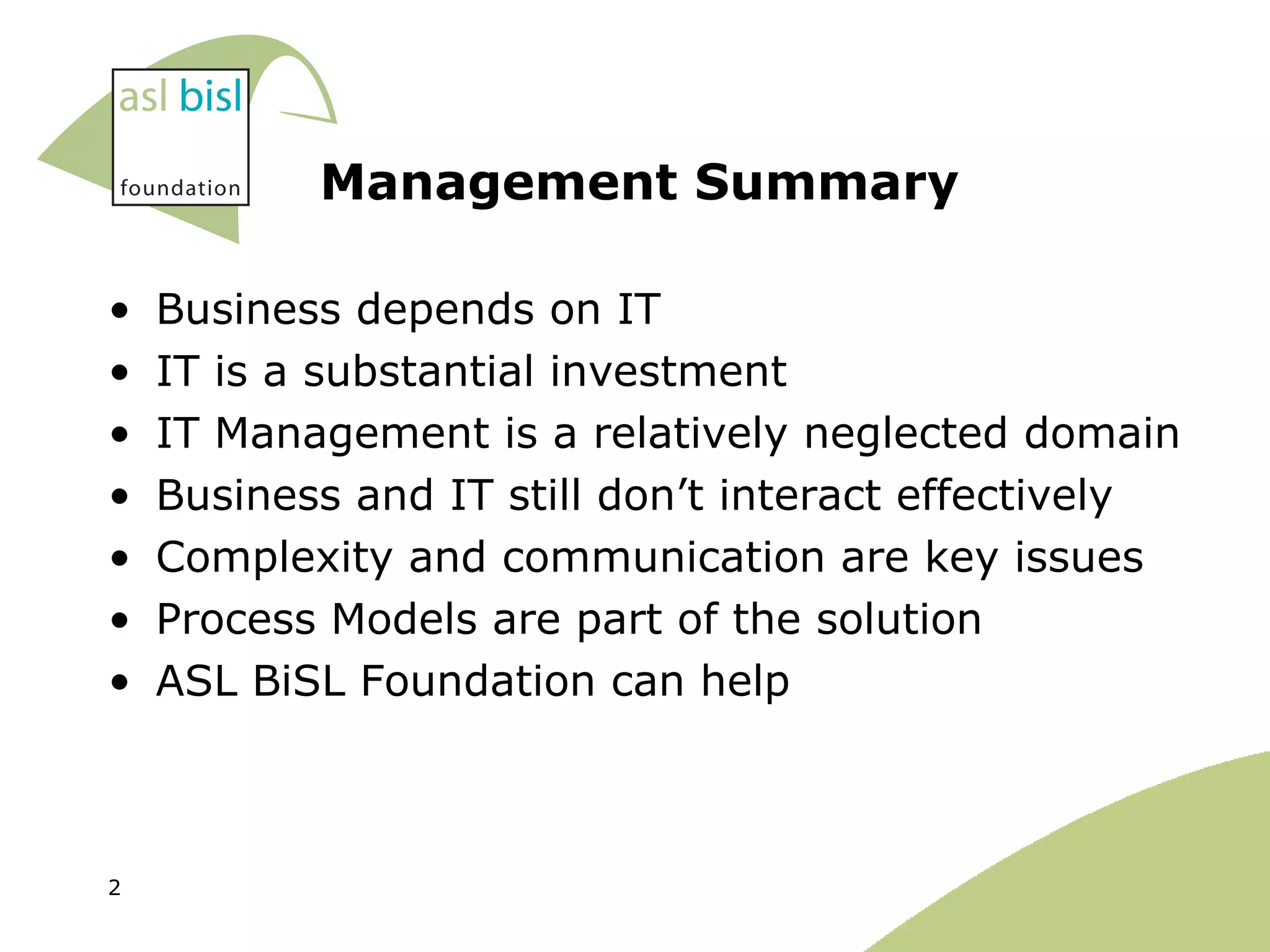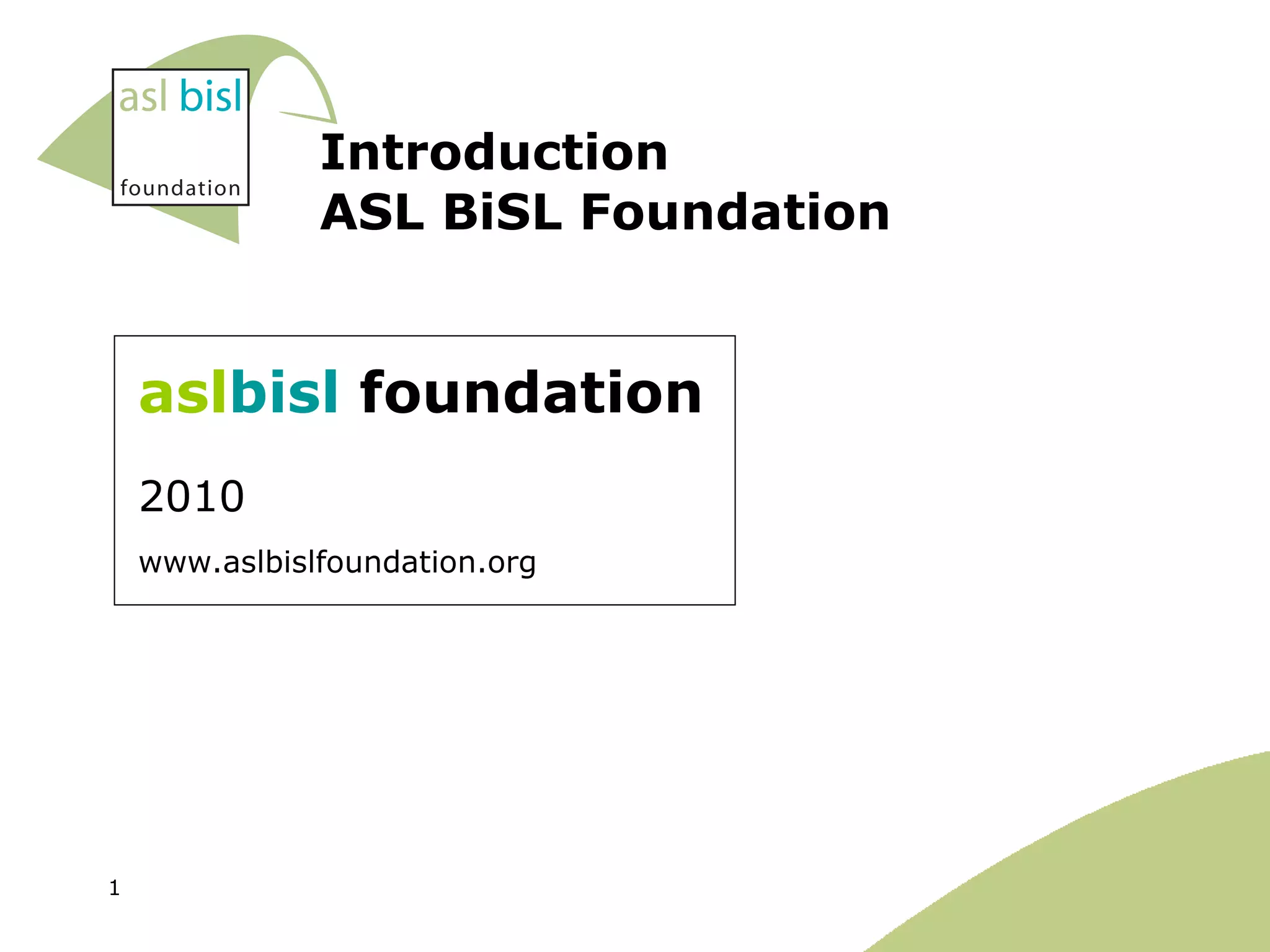 The ASL BiSL Foundation provides standards and best practices for IT management and application management to help improve interaction between business and IT. It aims to advance the professionalization of IT management. The Foundation was established in 2002 in the Netherlands and is funded by IT service providers and consumers. It develops frameworks like ASL (Application Services Library) and BiSL (Business Information Services Library) and offers related products, services, and certification to organizations around the world.