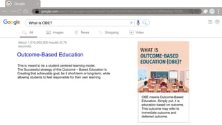 Outcome-Based Education (OBE) focuses on defining learning outcomes that students should achieve by the end of a program or course. It emphasizes aligning curriculum, instruction, and assessment with these outcomes. OBE can have immediate outcomes like skills developed in a single class, or deferred outcomes like career skills. Understanding by Design (UbD) is an instructional design framework that begins with defining learning objectives and assessments, then creates learning experiences to achieve the objectives. Outcome-Based Teaching and Learning (OBTL) aligns instructional methods with predefined outcomes to help students achieve them through active learning. The three approaches differ in their scope, with OBE applying at the program or institutional level, OBTL at the
