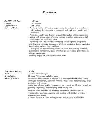 Asma Abdi Omar is seeking a challenging position that offers opportunities for advancement where she can employ and develop her skills. She has a college certificate in IELTS and a diploma in business management. Her experience includes positions as an HR manager, assistant store manager, and assistant sales manager where her duties involved customer service, staff management, and ensuring policies and procedures were followed. She has skills in Microsoft Office, languages of English and Arabic, and holds a UAE driving license.