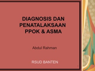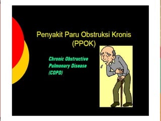 The document discusses diagnosis and management of chronic obstructive pulmonary disease (COPD). It notes that COPD is a progressive lung disease characterized by loss of lung function over time. Key points include that COPD includes conditions like chronic bronchitis and emphysema. Signs and symptoms include wheezing, cough, sputum production and shortness of breath. Diagnosis involves clinical evaluation, lung function tests, chest x-rays and blood gas tests. Management focuses on smoking cessation, bronchodilators, steroids and exercise, with care taken during dental work or surgery due to risk of infection or low oxygen levels.