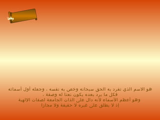 الوثيقة تتناول أسماء الله الحسنى، موضحة معاني كل اسم مثل الرحمن، الرحيم، الملك، القدوس، وغيرها، وتبرز صفات الله وعظمته. كما تشرح كيف أن هذه الأسماء تمثل نقاء وقداسة الله، وتؤكد أهمية الإيمان بعظمته في حياة الفرد. الوثيقة تعتبر أسماء الله الحسنى دليلاً على صفاته الفريدة، مؤكدة على ضرورة فهمها في السياق الروحي والديني.