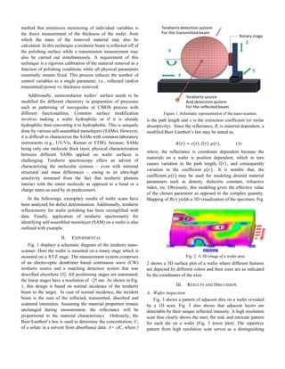 1) The document outlines applications of terahertz spectrometry, reflectometry, and sub-surface imaging for semiconductor wafer testing to minimize wafer rejects.
