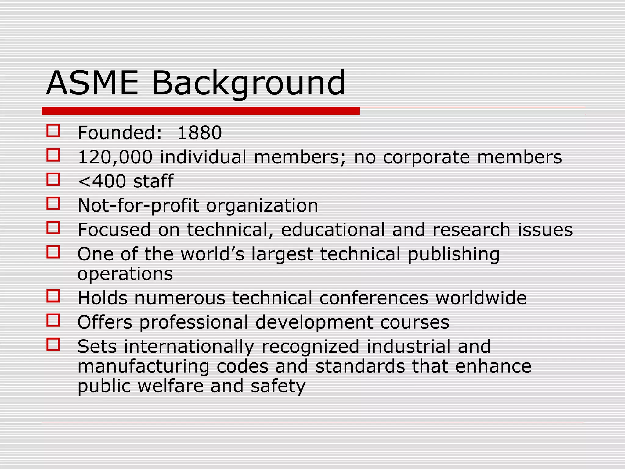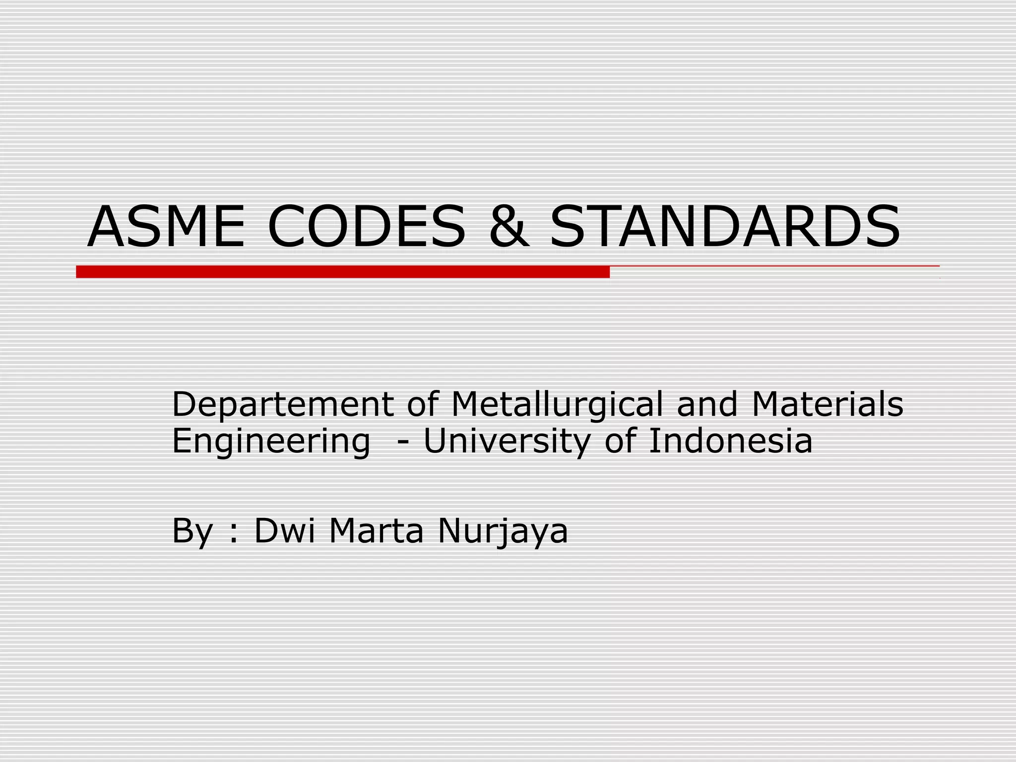 The document provides an overview of ASME codes and standards. It discusses that ASME was founded in 1880 and sets internationally recognized industrial and manufacturing codes and standards. It describes that standards are voluntary guidelines while codes become enforceable law when adopted by governments. The document outlines several ASME codes including those for boilers, pressure vessels, nuclear components, and piping systems. It provides details on ASME's standards development process and conformity assessment programs.