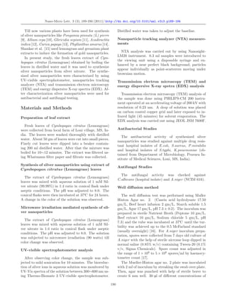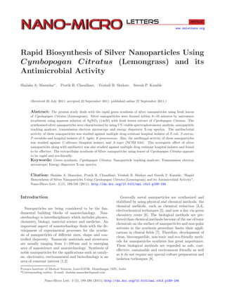 This document summarizes a study that used the leaves of lemongrass (Cymbopogan citratus) to rapidly synthesize silver nanoparticles. Silver nanoparticles formed within 8-10 minutes when a lemongrass leaf extract reacted with silver nitrate under microwave irradiation. The nanoparticles were characterized using UV-visible spectroscopy, nanoparticle tracking analysis, transmission electron microscopy, and energy dispersive X-ray spectroscopy. The silver nanoparticles showed antimicrobial activity against bacteria such as E. coli and S. aureus as well as fungi such as C. albicans, inhibiting their growth in laboratory assays. When combined with antibiotics, the silver nanoparticles enhanced the antibiotics' effectiveness against drug-resistant microbial strains.
