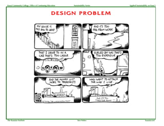 The document summarizes presentations from a sustainability series on applied sustainability on Kauai. It includes summaries of presentations on the design problem in sustainability, the concept of sustainability being something different than maximizing growth or entropy. It also summarizes information on lifecycle assessments of US household consumption and trends in energy usage, carbon emissions, and Kauai's renewable energy potential from various sources like solar, wind, biomass, and hydroelectric.