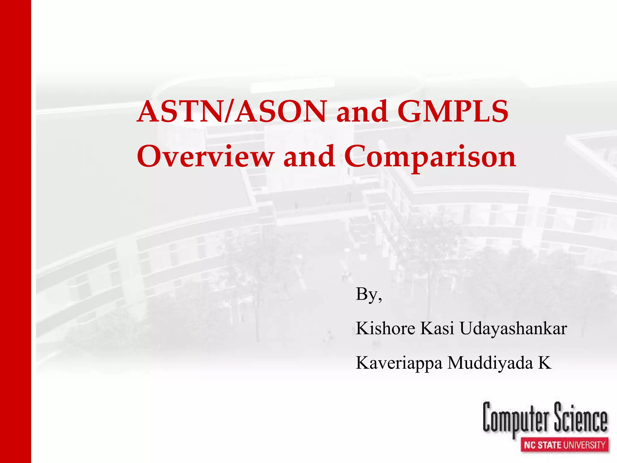 The document compares and contrasts ASTN/ASON and GMPLS frameworks for automating provisioning of transport networks. It discusses their motivations, architectures, resource models, control planes, policy-based management, and provides two use cases to illustrate policy-based management in GMPLS networks.