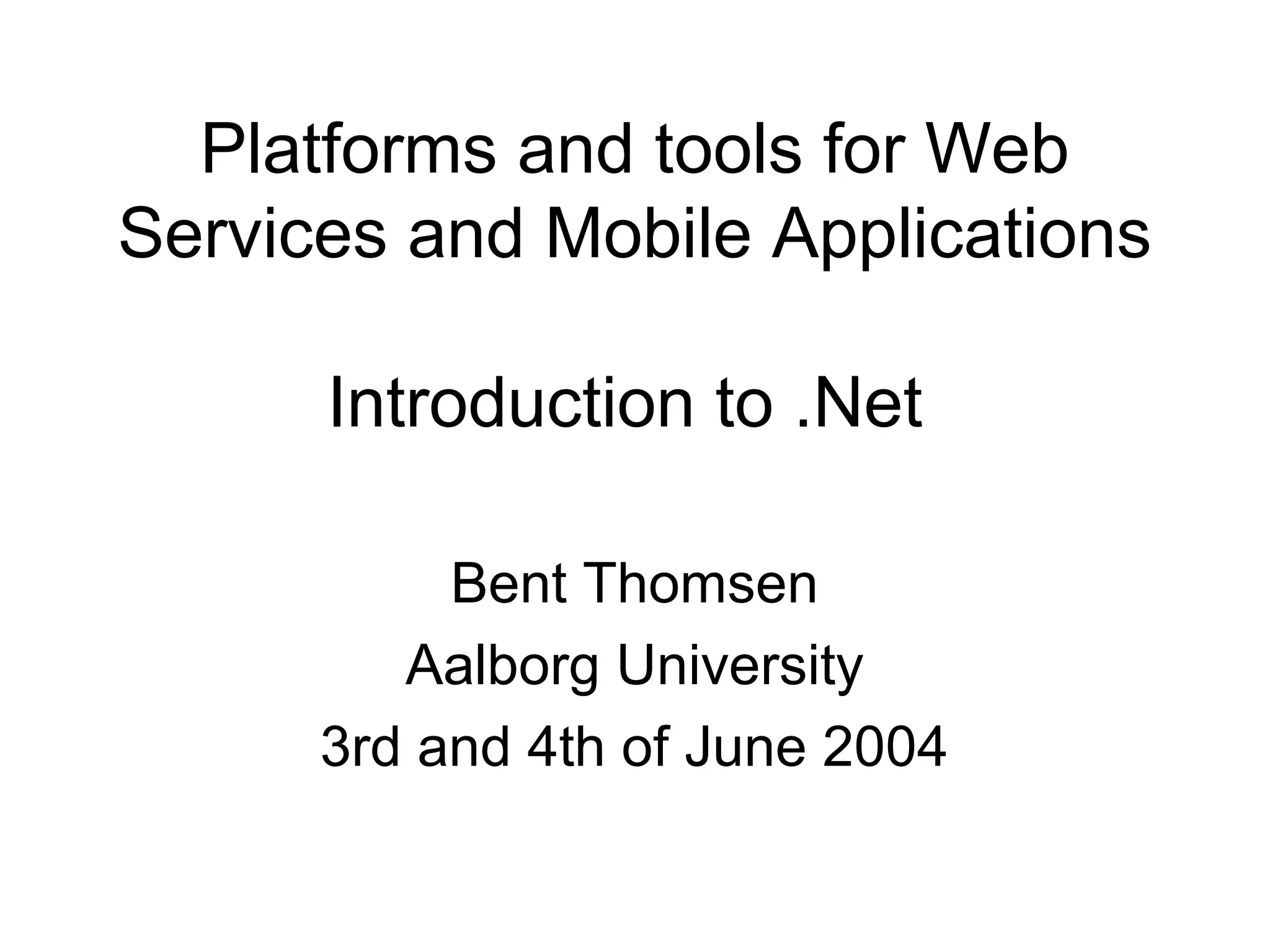 The document introduces Microsoft .NET and its tools and frameworks for building web services and mobile applications. It discusses the .NET Framework which includes a common language runtime, base class library, and languages like C# and VB.NET. It also summarizes web forms, web services, Windows forms, and how .NET applications can be built and deployed across platforms in an interoperable way using open standards.