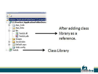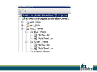 This document provides an overview of ASP.NET folders and the web.config file. It describes common folder types like App_Code, Bin, App_Data, and App_Theme and their purposes. It also explains the hierarchy and uses of the web.config file for configuration settings. Sections within web.config like system.web, connectionStrings, and customSections are outlined. Overall the document serves as an introduction to organizing files and customizing settings for ASP.NET applications through standard folders and the web.config.