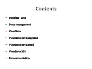 Stateless means there is no persistent connection between the server and client - the server responds to each client request independently without remembering previous requests. Stateless sites require clients to provide credentials for every request, while stateful sites maintain session state through techniques like cookies and viewstate. Viewstate stores page and control state to allow ASP.NET to repopulate form fields on postbacks, but it is only base64-encoded by default, not encrypted, so its contents may be readable or tamperable by attackers through tools like Fiddler. Developers should avoid storing sensitive data in viewstate and use encryption and signing to prevent viewstate tampering attacks.
