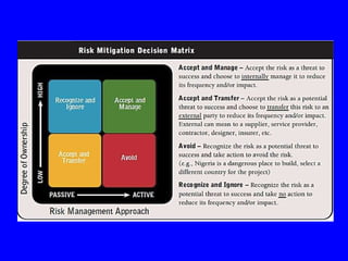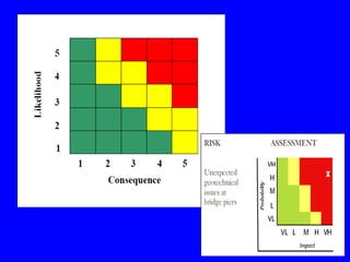 The document discusses various aspects of estimating and pricing construction contract risk. It provides examples of risk drivers in construction contracts related to scope, performance standards, changes, loss shifting, and schedule. It also discusses different approaches to pricing risk such as using risk premiums between 8-20% depending on market conditions. Effective risk management requires understanding different risk types and their impacts, and well prepared estimates can help document scope and risks to aid the project team.