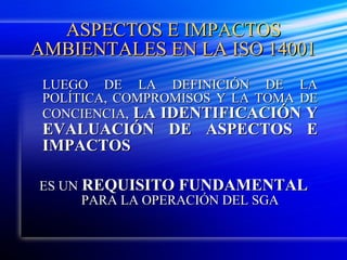 El documento describe los pasos para la identificación de aspectos e impactos ambientales según la norma ISO 14001. Explica que este es un requisito fundamental del SGA para evaluar cómo las actividades de una organización interactúan con el medio ambiente y establecer objetivos para mejorar el desempeño ambiental.