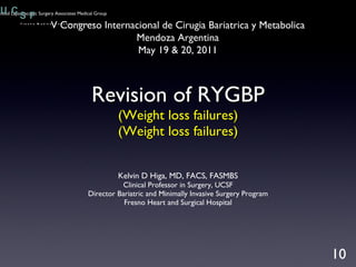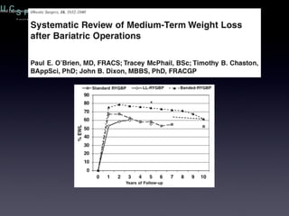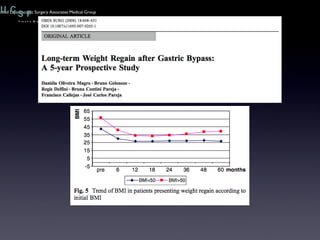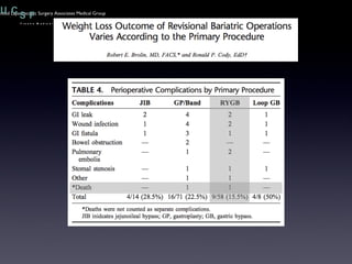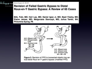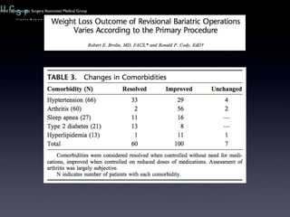 The document discusses revisional bariatric surgery options for patients who experience weight regain or inadequate weight loss after an initial Roux-en-Y gastric bypass procedure (RYGBP). It reviews various surgical techniques for revising the gastric pouch size and shape, lengthening or shortening the Roux limb, and adding an adjustable gastric band. A summary of the author's experience with 212 revisional surgeries found that patients experienced significant additional weight loss, though complication rates were high at 26%. Most patients reported being satisfied with the results of revisional surgery.