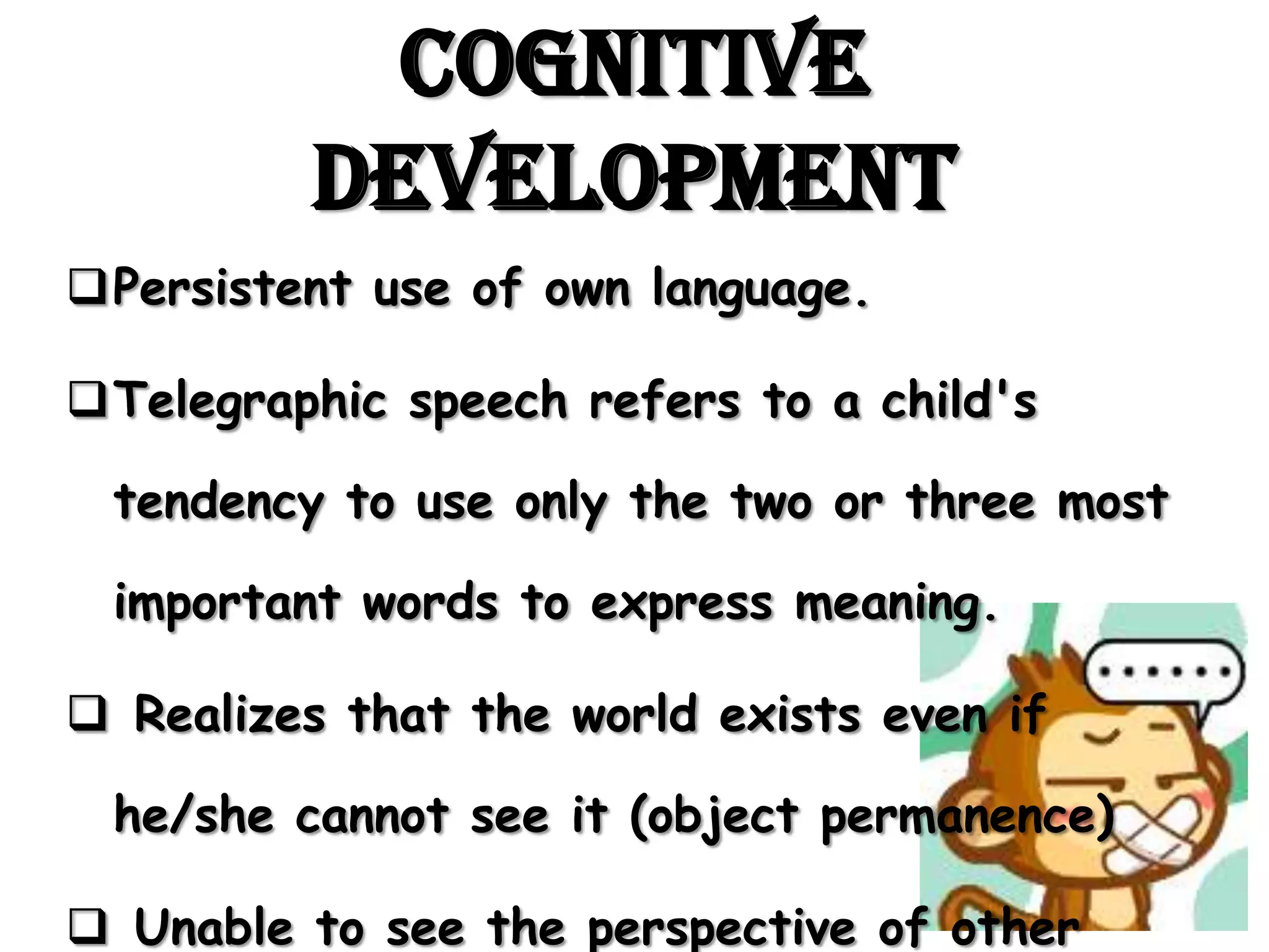 This document summarizes key aspects of development in toddlerhood (ages 1-3 years old). It discusses cognitive, physical, social, emotional, and moral development. Some main points include: toddlers develop object permanence and telegraphic speech; their physical skills improve with running, jumping and grasping; socially they begin play with others and identify with same-sex parents; emotions are fully expressed through affection, jealousy, and seeking attention.