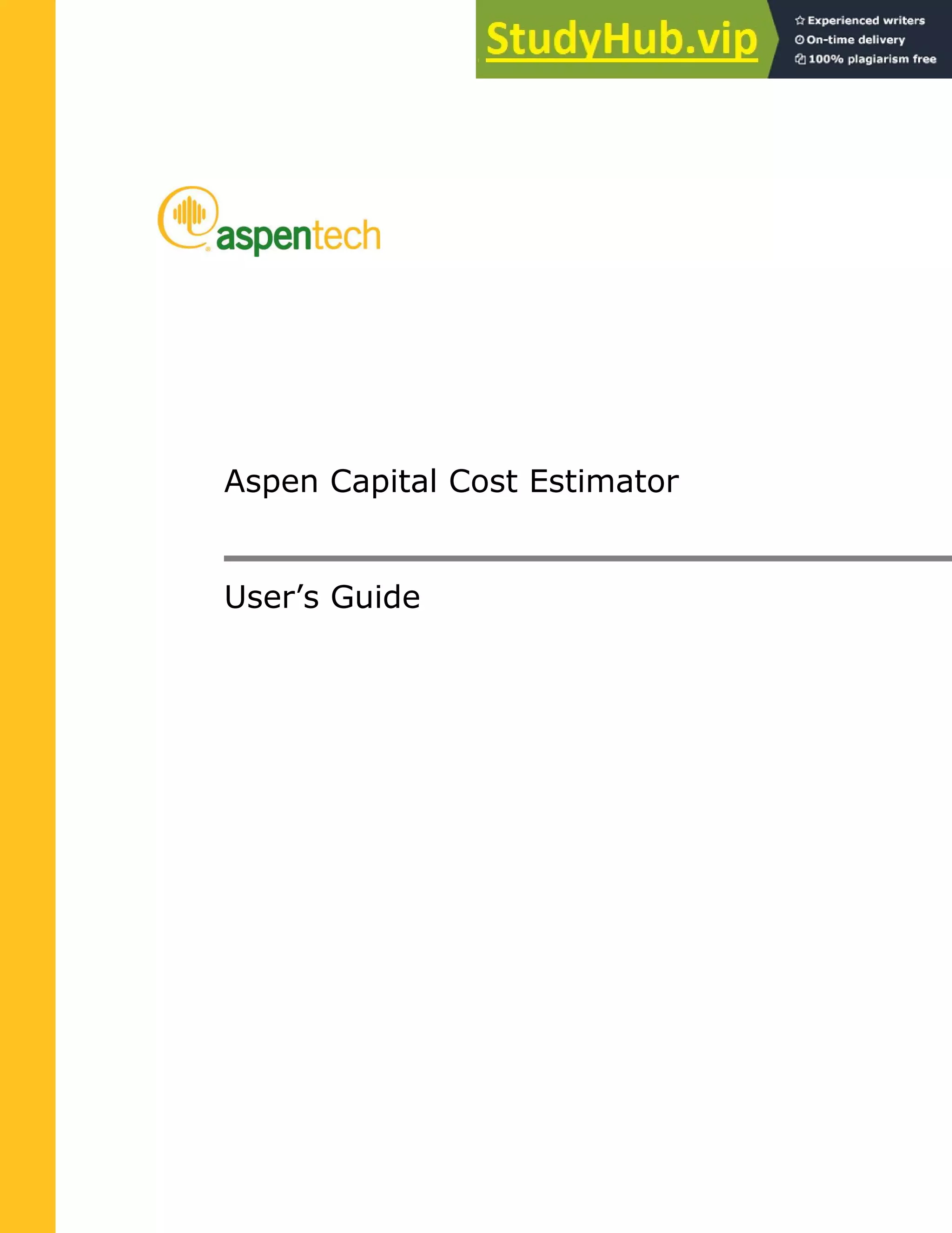 This document provides an introduction and user guide for Aspen Capital Cost Estimator software version 8.0. It describes the main features of the software including generating detailed engineering, procurement, and construction estimates and construction schedules. It explains how to start a new project, define the project basis, load and map simulation data, define project components, and develop cost libraries. It also covers utilities modules for designing cooling water and air systems. The guide is intended to help users understand the interface and workflow for using the cost estimating software.