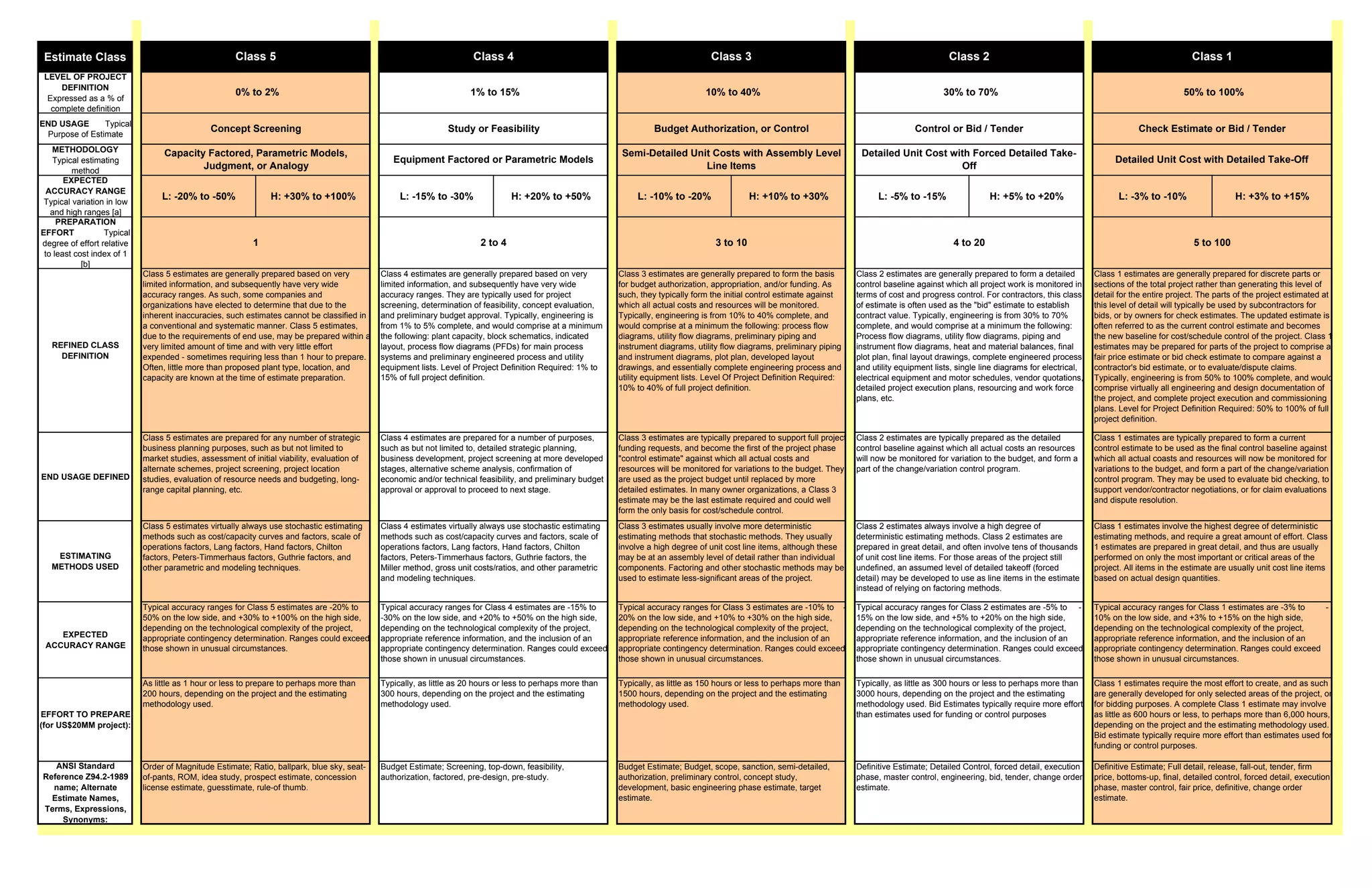 Class 5 estimates have the lowest level of project definition between 0-2% complete and rely on conceptual estimating methods like parametric models and analogy. They have the widest accuracy range from -20% to +100% and require the least amount of effort to create, sometimes less than 1 hour. Class 1 estimates have the highest level of project definition 50-100% complete and use detailed unit cost take-offs. They have the narrowest accuracy range from -3% to +15% but require the most effort, possibly over 6,000 hours. The classes progress from less defined estimates with wider accuracy ranges for early planning to highly defined estimates with tighter accuracy ranges for project control.
