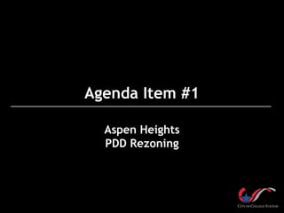 This document provides an overview of Agenda Item #1, which is a rezoning request for the Aspen Heights PDD. The proposed rezoning would allow for multi-family residential units with 2 to 5 bedrooms in buildings up to 40 feet tall. While the Planning & Zoning Commission recommended approval, city staff recommends denial due to concerns about traffic impacts on the existing transportation network. The applicant proposes some community benefits like road improvements and additional park funds if the rezoning is approved.